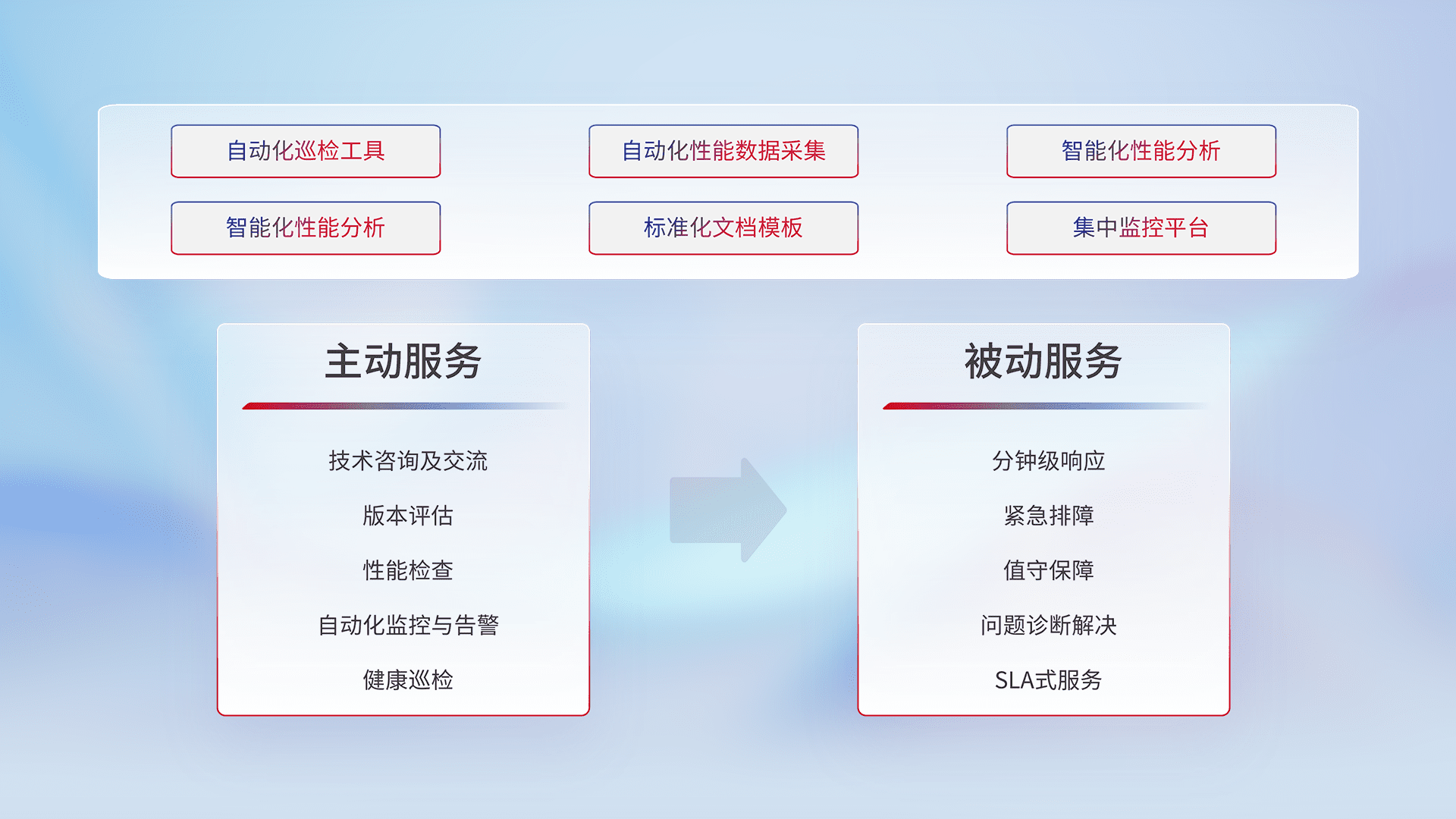 智能化工具和标准化文档,,保障服务质量,,,,提供主动服务(包含技术咨询、、、、版本评估、、、、性能检查、、、自动化监控与告警、、健康巡检)和被动服务包含(分钟级响应、、、、紧急排障、、、值守保障、、、问题诊断解决、、SLA服务)。。